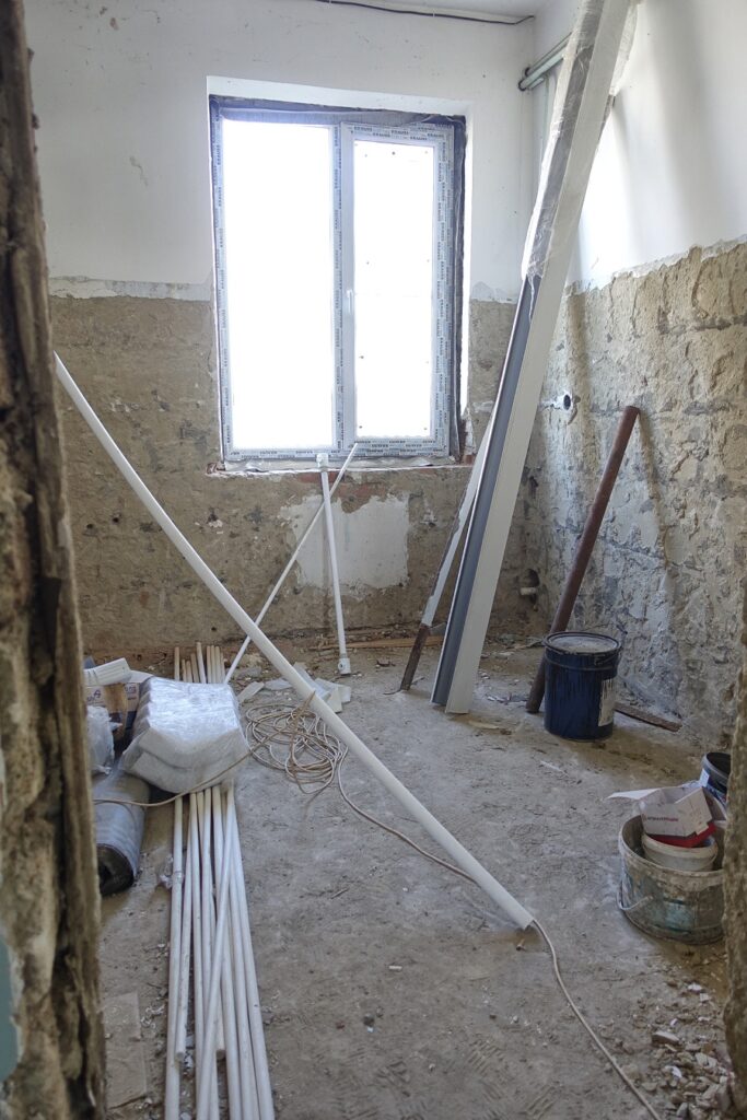 Одновременно идут и внутренние работы. Просторные помещения поделили на небольшие кабинеты, проемы заложили внутренними стенами. Их также утеплят. Полностью поменяли коммуникационные системы, отопление водопровод и канализация из современных материалов, смонтировали электропроводку. Старые окна заменили.
