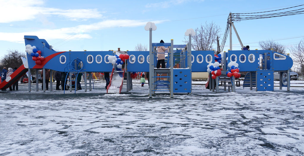 Изюминкой же новой площадки стало то, что главный ее объект выполнен в виде самолета. Представляете, как увлекательно детворе находиться внутри его «салона», выглядывать в иллюминаторы, а потом, как по надувному трапу, катиться с горки?